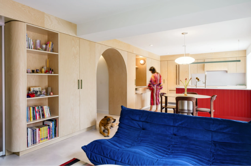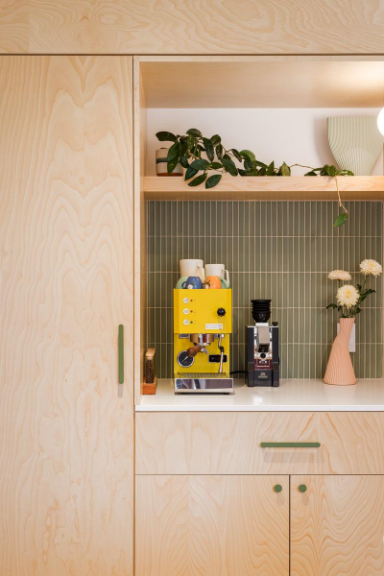 The architect used Columbia’s Birch-faced PureBond hardwood plywood throughout, brightening things up with a light, pleasantly-grained wood to create visual depth. Green hardware and accents add color and whimsy to the space.